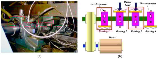 The experimental data were acquired by the Center for Intelligent Maintenance Systems (IMS) [28,29]. The experimental setup and its schematic diagram are displayed in Figure 3a,b, respectively. The vibration acceleration signals were collected every 10 min while input shaft speed was 2000 rpm (33.33 Hz) and the sampling frequency was 20 kHz. Two kinds of accelerated life test experiments were investigated: (1) the first test was carried out successively for 34 days (about 21,560 min), and (2) the second test was carried out successively for 8 days (about 9840 min). In this experiment, the severe wear failure in the inner race of bearing 3 and severe wear failure in the outer race of bearing 1 were respectively detected after dismantling. More details about the experimental description and experiment parameters can be found at the following website: http://www.imscenter.net/.
