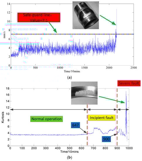 The health indicators time series; i.e., the EVI degeneration curve of bearing 3, and the Kurtosis degeneration curve of bearing 1—are illustrated in Figure 4a,b, respectively. The detailed calculation process of health indicator EVI can be found in ref. [15]. The kurtosis waveform presented in Figure 4b can be divided into running status based on vibration amplitude; i.e., (1) normal operation, (2) incipient fault, and (3) severe fault status. It also should be noted in Figure 6b that some sharp transition points (STPs) are displayed in the incipient and severe fault stages of bearing 1 degeneration.