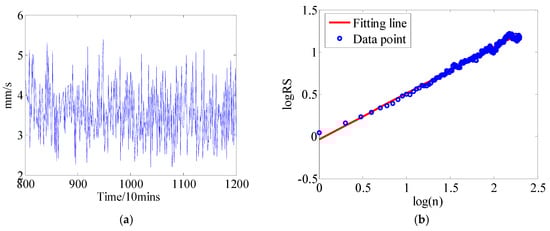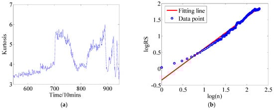Figure 5a shows the EVI curve of bearing 3, from the 801st-point to 1200th-point. The Hurst exponent is calculated via the R/S approach, as shown in Figure 5b. For the time series X(t), the R/S statistic can be expressed by,