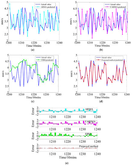 The EVI prediction results by the proposed method and the other state-of-the-art methods. (a) Prediction result using the autoregressive–moving-average (ARMA) model; (b) Prediction result using the fractionally autoregressive integrated moving average (f-ARIMA) model; (c) Prediction result using the fractional Brownian motion (FBM) model; (d) Prediction result using the proposed model; (e) Prognostic errors.