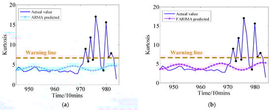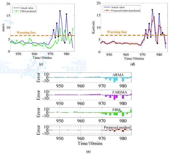 The kurtosis prediction results by the proposed method and the other state-of-the-art methods. (a) Prediction result using the ARMA model; (b) Prediction result using the f-ARIMA model; (c) Prediction result using the FBM model; (d) Prediction result using the proposed model; (e) Prognostic errors.