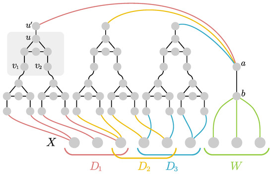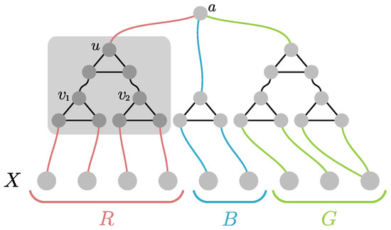 To construct the graphs for , we will employ the circuit gadget highlighted in Figure 1. Please note that if receive the same color, then u must be necessarily colored the same. In every other case, the color of u is arbitrary. Now for every three-partition of X we construct a testing gadget as follows: For every we arbitrarily pair the vertices in C and connect them via the circuit gadget (as ). If is odd, we pair some vertex of C with itself. We then repeat the construction with all the u-vertices of those gadgets, resulting in a hierarchical structure of depth (c.f., Figure 1 for an example construction). Finally, we add a single vertex a and connect it to the top vertex of the three circuits. Please note that by the properties of the circuit gadget, the graph is three-colorable iff the coloring of X does not induce the partition . In particular, the graph is three-colorable iff .