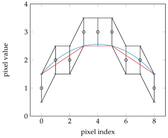 Discretized signal samples with upper and lower limits for the possible original function values. The minimized squared gradient magnitude (Laplace problem) assumption leads to a piecewise linear solution (red), while minimizing the bending energy or mean curvature leads to a higher-order smooth solution (blue).
