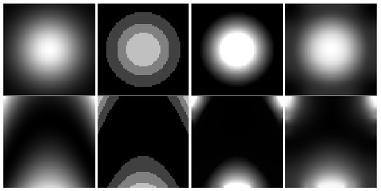 Top row: Gaussian function; Bottom row: Rosenbrock function. From left to right: 8-bit reference image, downscaled 2-bit image, Laplace reconstruction, and biharmonic reconstruction.
