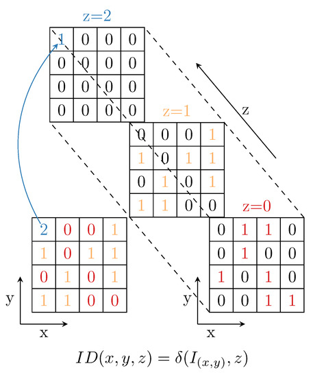 - the cells are filled with zeros, except the ones where the z coordinate of the cell equals the pixel value in the same (x,y) position in the image.