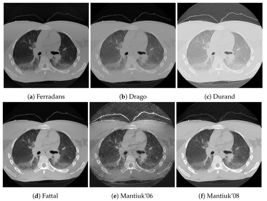 These descriptors above are used to compare the tone mapping operators to the proposed algorithm in two cases: a chest CT where the low tissue densities (lungs) are significant, and a head CT where the medium densities (white and gray matter) play an important role.