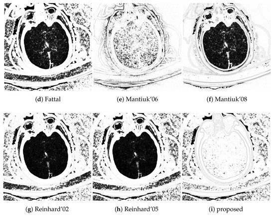 As was mentioned in Equation (7), base-detail layer separation is a frequent approach. Edges could be separated from the image, and added back to the compressed image. However, this technique is applicable to all tone mapping approaches. Such edge enhancement was not applied for the reference operators, and, for the sake of fair comparison, the proposed method does not contain such edge enhancement either. Similarly, auto-leveling, a method which slightly stretches image contrast, was not applied in the traditional TMOs or in our proposed method.
