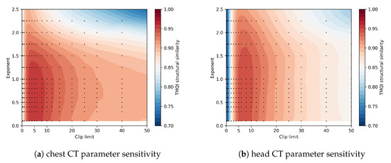 The parameter sensitivity of the algorithm is an important question. The TMQI structural similarity score is depicted in Figure 10 as the function of the exponent and the clip limit. There is a central region where the TMQI score is relatively stable and any parameter pair from this range is a reasonably good choice, e.g., , seems to be a good starting point. As will be discussed in the Optimization section, the calculation can be sped up without sacrificing the image quality too much. With lower precision calculations, the parameter space is quickly discoverable.