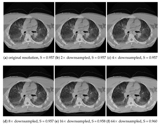 Calculating the histograms using spatial downsampling along each axis. Even significant downsampling does not cause very visible artefacts, which is also reflected in the TMQI score. However, local differences might appear, e.g., compare the middle region of the left lung in (a) and (f).