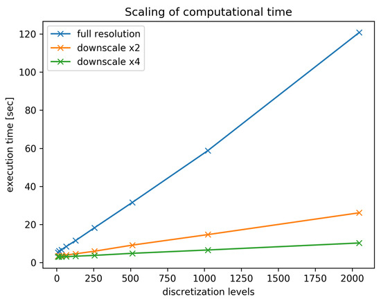 In both cases, the linear interpolation makes the approximation robust, which to a certain extent can compensate for the downsampling error, both in spatial and in color space. In exchange for precision loss, the computation time could be greatly reduced, as is shown in Figure 13. The execution time (t) is approximately linear in the number of pixels and in the discretizaton levels (D), not counting a small constant overhead (O). The number of pixels is inversely proportional to the square of the downscaling factor(x):