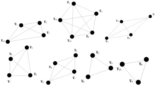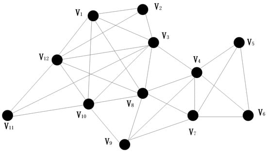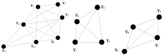 Given network , is a node-set including n nodes. Set N as the size of a possible fully coupled network. Starting from a set , find all the N-size communities which contain node , then delete node and the edges that connect the node . After we find all the N-size factions, set until N equals 2. So far, we have found the community structure of all the different factions in the network. In this paper, we use a 12-node diagram as an example to illustrate the community partition based on the factional filtering algorithm, with a value of N of 4.