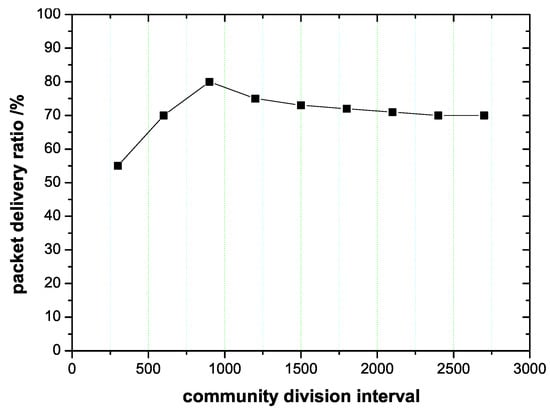 In a community-based opportunistic social network, the role of the community division interval is important. In a period of time, it can be considered that the status of a node and communities in the network do not change, and data transmission can be stable. If the division interval is relatively small, because the community result is not stable enough, the guiding effect of community division on the routing algorithm is not good, and the packet delivery ratio is low. As the division interval increases, the packet delivery ratio increases correspondingly as shown in Figure 4. When the interval is selected as 900 s, the optimal packet delivery ratio is 80%. As the division interval continues to increase, the packet delivery ratio decreases. At 2700 s, the packet delivery rate is 70%, and the algorithm performance is worse than that at 900 s. This is because when the interval of community division is too long, the true node distribution state is not consistent with the assumed stable state, and previous community segmentation results do not represent the latest community structure well.