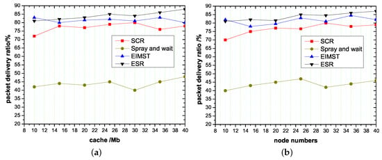 The packet delivery ratio of the ESR algorithm, EIMST algorithm, Spray and wait algorithm and the SCR algorithm at different node cache sizes and numbers of nodes. (a) The effect of node cache on packet delivery ratio; (b) The effect of node numbers on packet delivery ratio.