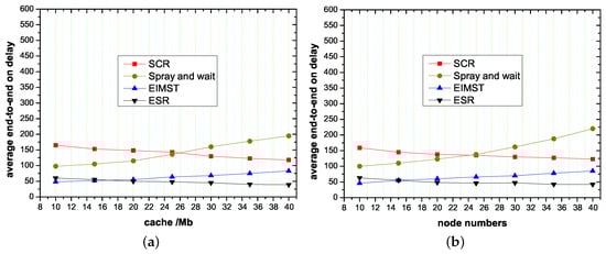 The average end-to-end transmission delay of ESR algorithms, EIMST algorithm, Spray and wait algorithm and SCR algorithm when at different node cache sizes and number of nodes. (a) The effect of node cache on transmission delay; (b) The effect of node numbers on transmission delay.