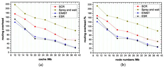 The average routing overhead of the ESR algorithm, EIMST algorithm, Spray and wait algorithm and SCR algorithm when at different node cache sizes and number of nodes. (a) The effect of node cache on routing overhead; (b) The effect of node cache on routing overhead.