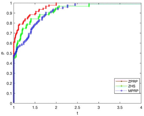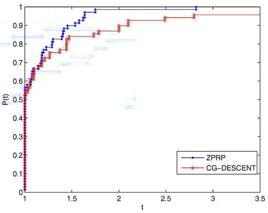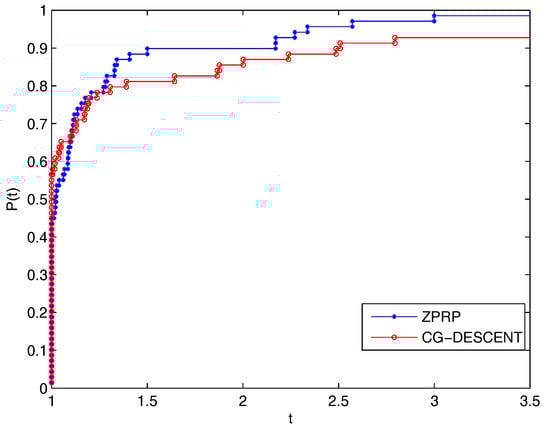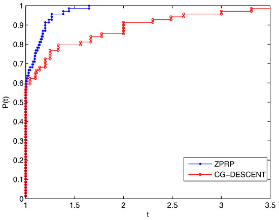 We first evaluate the performance of the ZPRP method with that of CG-DESCENT proposed by Hager and Zhang (2005) and all methods with the Wolfe line search (6). Figure 1, Figure 2 and Figure 3 show the numerical performance of the above methods related to the total number of iterations, the number of function and gradient evaluations, CPU time, respectively, which are evaluated using the profiles of Dolan and Moré [22]. For each method, we plot the fraction P of problems for which the method is within a factor t of the smallest number of iterations, or the smallest number of function evaluations or least CPU time, respectively. The left side of the figure gives the percentage of the test problems for which a method is the fastest; the right side gives the percentage of the test problems that are successfully solved by each of the methods. The top curve is the method that solved the most problems in a time that was within a factor t of the best time. Clearly, the ZPRP method has the better performance since it illustrates the best probability of being the optimal solver, outperforming CG-DESCENT. From Figure 1, we can obtain the ZPRP method solves about 59.5% of the test problems with the least number of function evaluations while CG-DESCENT solve about 56.5% of the test problems. For the total number of function and gradient evaluations, in Figure 2 illustrates that the ZPRP method solves 55.2% of the test problems with the least number of function and gradient evaluations while CG-DESCENT solve about 52.2% of the test problems. Therefore, the ZPRP method outperforms CG-DESCENT.