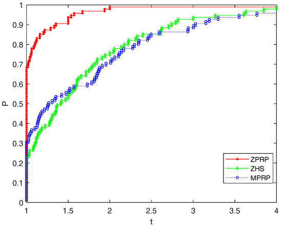 In the sequel, we compare the performance of the ZPRP method with that of the ZHS method and the MPRP method in [18] and all methods with the line search (9). Figure 4, Figure 5 and Figure 6 list the performance of the above methods relative to CPU time, the number of function evaluations and the number of gradient evaluations, respectively. From Figure 4, we can observe that the ZPRP method outperforms the MPRP and ZHS method. More analytically, the performance profile for the number of iteration shows that ZPRP can solve 61% of the test problems with the least number while MPRP and ZHS solve about 47.5% and 45.2% of the test problems, respectively. As regards the number of function and gradient evaluations, Figure 5 shows that the ZPRP solves 80% of the test problems with the least number. Hence, the performance of the ZPRP method slightly better than that of the MPRP and ZHS methods.