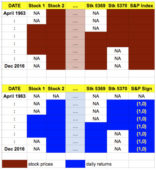 Daily returns of all component stocks that were a part of the S&P 500 index between April 1963 and December 2016 are collected in a table with dates on the rows and stocks on the columns. Since there are many additions and deletions of stocks from the index, we end up with 5370 different stock tickers over the sample period, and these account for several additions to, and deletions from, the index, over a period of 54 years (13,532 trading days) covered by our sample. This data matrix contains many missing values, as only 500 stocks at a time exist in the index, and is therefore a semi-sparse data matrix. The degree of sparsity is 68.54%. We also counted the proportion of days on which the index rose (versus fell), which is of the time. All told, we have a daily return matrix comprising 13,532 rows and 5372 columns (noting that one of the columns is for dates and the remaining for stocks, and the index). See Figure 2 for a depiction of the stock price and return data. Note that the price and return matrix is sparse as all stocks did not trade on all dates.