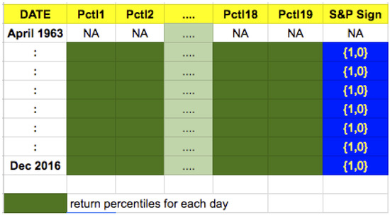 Our remediation entails using only a few return percentiles each day, which results in a drastic reduction in dimension of the feature set. We convert the daily returns of the 500 underlying component stocks to percentiles. The percentiles considered are at the 1, 2, 3, 5, 10, 15, 20, 30, 40, 50, 60, 70, 80, 85, 90, 95, 97, 98, and 99 percentile levels. This results in a dataset that has the sign of the daily return (direction) of the S&P as the (binary) dependent variable, and 19 percentiles as the explanatory variables per day, thereby reducing daily data dimension from 500 to 19. These percentiles allow us to capture the entire distribution through a discrete approximation, and places each day’s data into a standard data structure for the probability distribution of returns. This reorganization of the data allows us to abstract from the fact that the underlying stocks in the index are changing, yet considers the influence of their returns in predicting the forward movement of the S&P. It allows modeling the return of the index based on all its 500 component stocks at any point in time, reduced to a summarized set of values. It also results in a tidier dataset for the prediction exercise that is the focus of our analysis. In addition, there are no missing values in the transformed data matrix. With a look back period of 30 days, for example, each row of the dataset now has size 570 () values of stock return percentiles. The dataset is no longer sparse and is shown in Figure 3.
