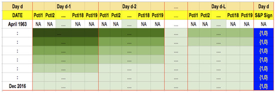 That is, we pass into the function the last L days of data to predict the movement on the next day, or subsequent days. For each day in the L-day history, we may have C columns of data. In our experiments, , and these are percentiles of the return distribution for the 500 stocks in the index. Thus, the model uses inputs to generate a binary classification M. For training purposes, N such inputs will be used, i.e., N rows of features, each of size . We note that . The dataset is depicted in Figure 4.