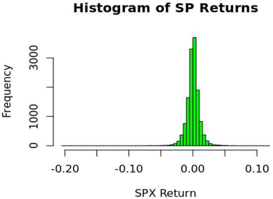 We begin by reviewing some attributes of the data. The distribution of the S&P returns is shown in Figure 5. As seen from the histogram returns are tightly distributed with most of the daily returns between and . The distribution has mild negative skewness and high kurtosis, both known features of index return data.