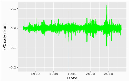 A plot of the daily returns, shown in Figure 6, confirms the presence of large outliers, leading to kurtosis, and periods of high and low volatility.