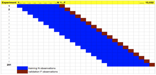 We perform repeated training and validation using rolling period samples. Our training set size is and each row in the training data comprises data from days. After training our deep learning net, we then forecast the next days market direction. We then roll the sample F days forward and repeat this experiment. Altogether, depending on the value of F, we have different numbers of experiments. For example, when , we conduct 422 experiments across the entire time series of the dataset (think of this as 422-fold cross validation). The general scheme is shown in Figure 7. Training for each experiment across all rolling cases takes about 3 h, with 6 CPU and 25 GB assigned to the h2o cluster. Therefore, each episode of training and test takes less than 30 s.