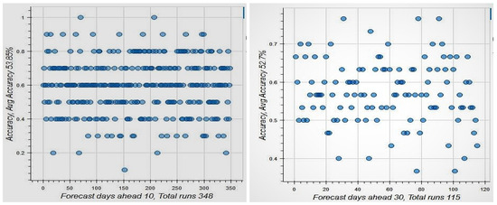 Forecast period average accuracy, where the look back period is days and the forecast period is days. Forecast period average accuracy is 64% for days and 77% for days, both well over 50% as can be seen from the number of points in Figure 8 that lie above the level on the y-axis. The overall accuracy is slightly over 50%, i.e., 53.9% for days and 52.7% for days.
