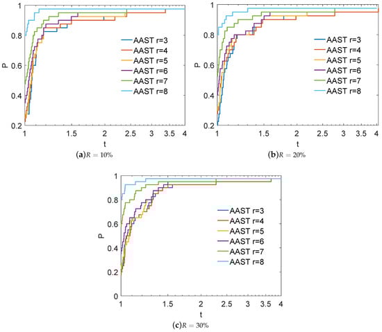 In the sequel, we focus our interest on the experimental analysis for the best value of parameter k; hence, we have tested values of k ranging from 3 to 8 in steps of 1. Figure 1 presents the performance profiles for various values of parameter k, relative to the used ratio of labeled data. Clearly, AAST exhibits better classification performance as the value of parameter k increases, revealing its sensitivity. More specifically, using as labeled ratio, AAST with and 8 classifies , , , , and of the test problems with the highest accuracy, respectively. Furthermore, AAST with and 8 classifies , , , , and of the test problems with the highest accuracy, respectively for labeled ratio as well as , , , , and , respectively for labeled ratio.