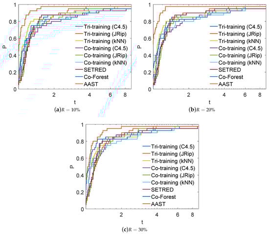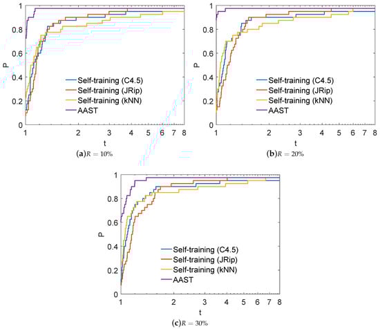 Figure 2 presents the performance profiles for Self-training and AAST. Obviously, AAST illustrates the highest probability of being the optimal classifier since it corresponds to the top curve, regarding all used labeled ratio. More analytically, AAST reports the best performance, classifying , and of the test problems with the highest accuracy using , and as labeled ratio, respectively, followed by Self-training (kNN) reporting , and , in the same situations.