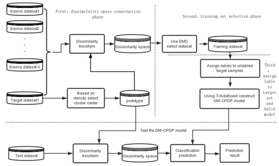 - In order to construct the defect prediction model, we propose the DM-CPDP method. After constructing the dissimilarity space, this method uses the EMD method to select the samples in the dissimilarity space as the training dataset. For the unlabeled samples converted from the target set, the KNN algorithm is used to label those samples. TrAdaBoost method is utilized to establish the prediction model based on the selected training dataset. The DM-CPDP method avoids using the original feature space to construct the defect prediction model. In the traditional defect method, the defect prediction model makes multi-source domain data be fully utilized.