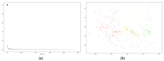 Then, the cluster center is selected by considering and in combination, and the method is shown in Formula (4). and maybe in different orders of magnitude, we normalize these two quantities, is the normalized process. As shown in Figure 2, the points are sorted in descending order of and represented in the form of a graph. The value of the non-cluster centers are relatively smooth and there is a clear jump from the non-cluster center to the cluster center. The points above the inflection point are chosen as the cluster centers.
