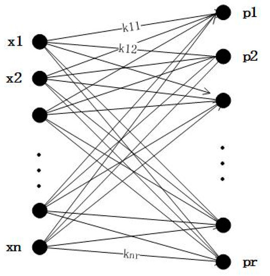 In the transformation process, we first use the arc-cosine kernel function to measure the dissimilarity between each original sample and the prototype set, and these values are used as row vectors, and then the low-dimensional dissimilarity space is constructed. The process is shown in Figure 3 and Equation (6). The dimension of this space is determined by the number of samples in the prototype set R. represents the dissimilarity between the sample and the prototype sample .