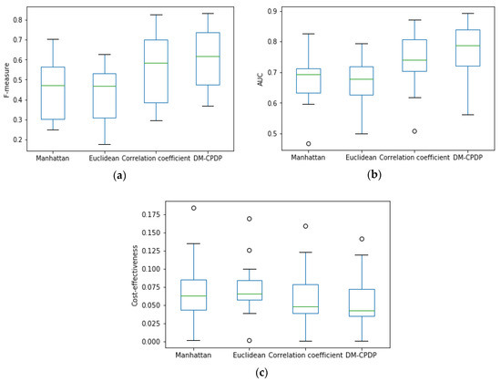 Figure 4 is the box plot of performance indicators, which compare the values of several different dissimilarity metric methods on F-measure, AUC, and cost-effectiveness. Euclidean distance, Manhattan distance, and correlation coefficient are chosen as the measurement of dissimilarity.