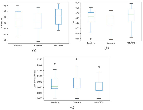 It can be seen from the box plot that the density-based prototype selection method used in this paper is better than the random selection method and the K-means clustering method. In Figure 5, the density-based prototype selection method used by the DM-CPDP has higher value of median, quartile, maximum, and minimum on the F-measure and AUC than the other two methods. These cost-effectiveness values for density-based prototype selection method are lower than other methods. However, the K-means clustering method performs the worst, so this method is not suitable for prototype selection.