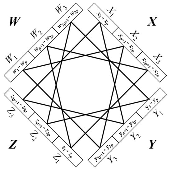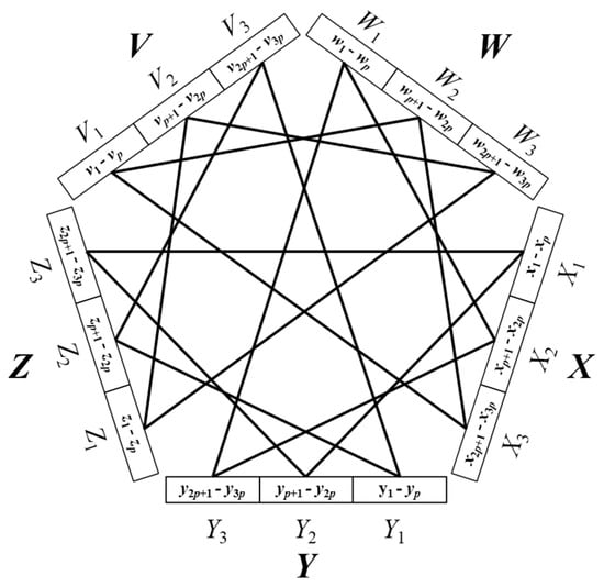 - To see that , we expand the summationsand exploit the symmetry given by . In Equation (A1) or (A2), we can substitute for , for , for , …, and for to yield the other equation.