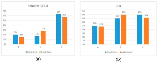 In total, we can see in Figure 1 that the majority of misclassified segments from classes A and B, were classified by Random Forest into class C (57% EN-GR and 63% EN-IT), for classes A and C (28% EN-GR and 17% EN-IT) were incorrectly classified into B. We observe low percentages (15% EN-GR and 20% EN-IT) from classes B and C to class A. The majority of misclassified instances from classes A and B were classified by DL4J into class C (40% EN-GR and 36% EN-IT), for classes A and C (35% EN-GR and 40% EN-IT) were incorrectly classified into B. We observe low percentages (25% EN-GR and 24% EN-IT) from classes B and C to class A.