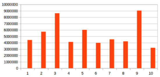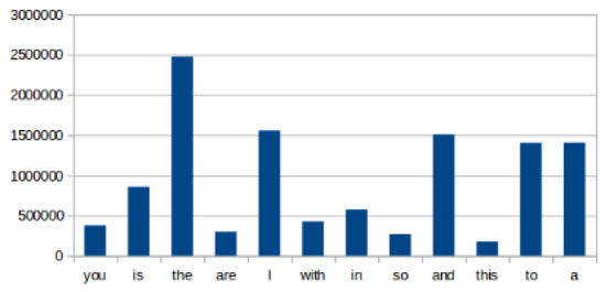 In Figure 3, we present the biggest key from each partition shown in the previous figure as well as the following second and third biggest key from partition nine represented by the last two words, their size is measured by how many times they appear. Although the biggest key from the ninth partition is not as big as the key from the third, it alone is the greater than the sum of the smaller ones. Along with an already large key, other two equally large ones contribute to unbalance the partitions. If those larger keys where to be separated it would greatly benefit the load distribution.