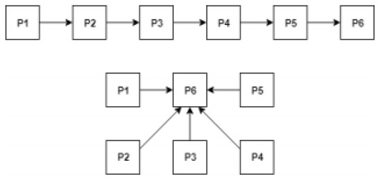 Figure 4 shows two simple example of a page rank execution where page 6 is reached by the same pages. In the first example, page 1 must pass through all other pages to reach page 6 meaning their distance is five. In the second example, all pages are directly linked to page 6 meaning their distance is one. In the end, example one is computationally heavier than example 2 since it need to check all links from each page to find the path that links page 1 to page 6.