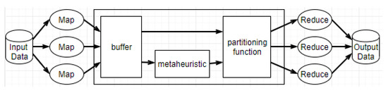 Our strategy, named MAPSkew, is a metaheuristic-based approach for online load balancing in MapReduce environments with skewed data. MAPSkew works in the shuffle phase, accumulating a percentage of the input data processed by the map phase and executing a metaheuristic for finding a partitioning over this accumulated data searching for minimizing the unbalancing defined in Definition 1. This process is repeated respecting the key already allocated until all the input data is processed. The Figure 6 shows the architecture of MAPSkew.