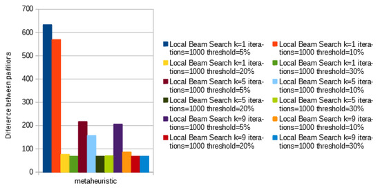 As shown in Table 1, the metaheuristics reduced the skew by up to . Local and Stochastic Beam Search Achieved great results with threshold percentage being a major factor while K and temperature being not so relevant at a first sight. To improve our investigation about the most relevant attribute, in Figure 7 we set the number of iterations to 1000 and analyze the threshold and number of candidates per iterations. Every time the threshold reach 20% the difference between partitions suffers a huge drop, especially when only one candidate is selected per iteration.