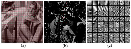 We first introduce the Fast Dictionaries Learning Method on Classified Patches (FDLCP) [] into salt and pepper noise removal. FDLCP not only inherits fast learning to form orthogonal dictionaries, but also provides sparser representations by training comprehensive dictionaries for different geometrical image patches. As shown in Figure 2, patches that share the same geometric direction are grouped together to form one class, and then this class is used to learn a specific dictionary. Therefore, the dictionary of each class effectively captures the underlying image structures (Figure 2c).