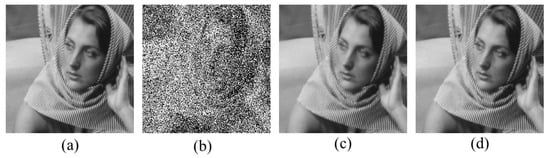 The algorithm is summarized in Algorithm 1. It is worth noting that the existing ADMC algorithms solve either a reconstruction model with minimization of L1 norm (sparsity regularization) and L2 norm (data fidelity) in compressive image recovery [,,], or a denoising model with minimization of L1 norm (sparsity regularization) and L1 norm (data fidelity) for impulse noise removal [,]. The ADMC algorithm derived in the work solves the denoising model with minimization of L0 norm (sparsity regularization) and L0 norm (data consistency) as Equation (14) and has totally different sub-problems and solutions from previous ones.