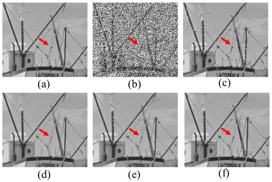 Denoised boat images at the noise level of 0.5. (a) is the noise-free image, (b) is the noisy image, (c)–(f) are denoised images using AMF, PANO-L1, TV-L0, and the proposed FDLCP-L0, respectively.