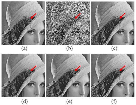 Denoised Lena images at the noise level of 0.5. (a) is the noise-free image, (b) is the noisy image, (c)–(f) are denoised images using AMF, PANO-L1, TV-L0, and the proposed FDLCP-L0, respectively.