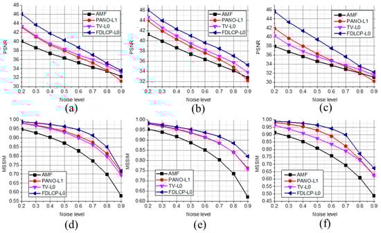The proposed method, FDLCP-L0, is compared with basic AMF [], the state-of-the-art PANO-L1 [] and total variation (TV)-L0 methods []. Two objective evaluation criteria, the peak signal-to-noise ratio (PSNR) and the mean measure of structural similarity (MSSIM) [], which are most widely used in image denoising and reconstruction [,,,,], are adopted to quantitatively measure the denoising performance here. The PSNR measures average pixel distortion of the denoised image and the MSSIM specifically cares about the preserved image structures, e.g., local luminance and contrast, which are important for human visual systems []. Higher PSNR and MSSIM mean better denoising performance. All the computations were performed on four cores 3.6 GHz CPU desktop computer with 16 GB RAM. The typical reconstruction time of a 512 × 512 image with AMF, PANO-L1, TV-L0, and FDLCP-L0 are 0.25 s, 55.7 s, 6.74 s, and 473.22 s, respectively. The test images are downloaded from website [].