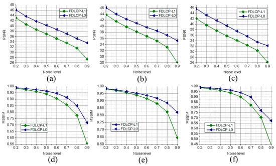To further confirm the advantage of using the L0 norm over the L1 norm, FDLCP-L1 is compared with the proposed method FDLCP-L0. Typical denoised images are shown in Figure 7 and quantitative measures are shown Figure 8, Table 2 and Table 3. Image features are preserved much better using FDLCP-L0 than that using FDLCP-L1. Consistent improvements at all noise levels are observed for FDLCP-L0. Therefore, replacing the L1 norm with the L0 norm is valuable to improve the quality of the images that are contaminated by the salt and pepper noise.