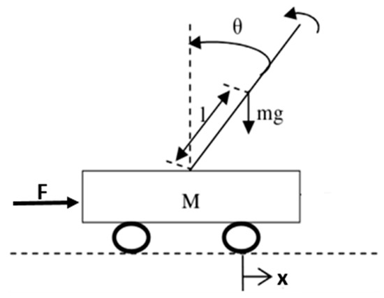 The main feature of this controller is a complex non-linear control problem, with its complexity originating from the nonlinear nature of the plant [41,42]. The main goal of the controller is to apply a force to move the cart so that the pendulum remains in the vertical unstable position. The cart pole system is shown in Figure 5, where x is the cart position, θ is the pendulum angle, and F is the control force applied, parallel to the rail, to the cart, where g = 9.81 m/s2.