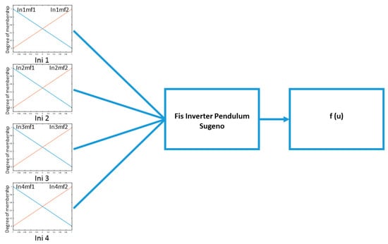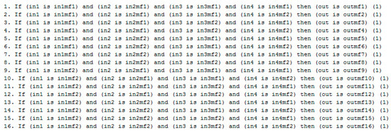 The fuzzy system for this problem is of Takagi-Sugeno type, using the max aggregation and the weighted average defuzzification, which is composed of four inputs with triangular membership functions and a one output with 16 linear functions, as represented in Figure 6, and the fuzzy rules that are considered are shown in Figure 7.