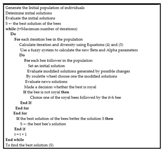 Figure 10 illustrates the pseudocode of the modified BCO with parameter adaptation. The main difference with respect to Figure 9 is can be found in calculate the iteration and diversity values and to find the new beta and alpha parameters through of the fuzzy logic system.